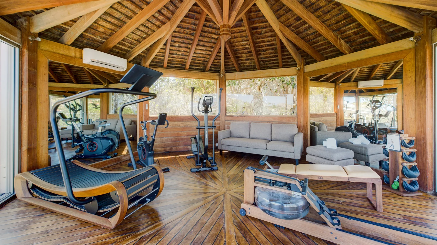 For wellness and recreation, the estate includes a fully equipped fitness pavilion housed within a glass gazebo, offering inspiring ocean vistas. Residents also benefit from access to the exclusive tennis courts of Domaine du Levant, located just below the villa.