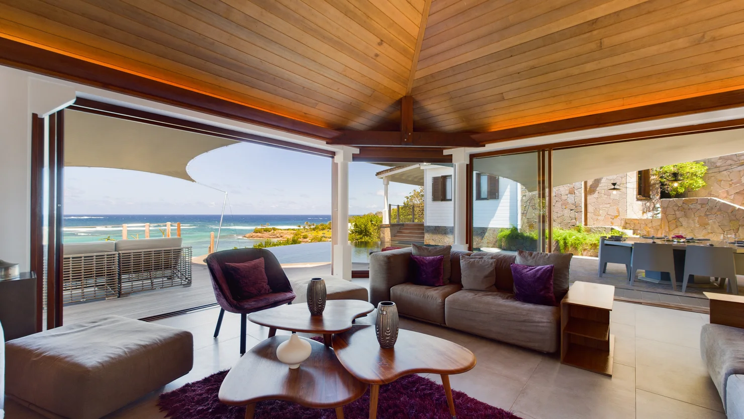 A true architectural masterpiece, Indian Song harmoniously blends refined elegance with timeless design, showcasing noble materials such as natural stone and fine wood throughout. The estate is composed of several pavilions cascading down the hillside, each thoughtfully positioned to capture sweeping ocean views.