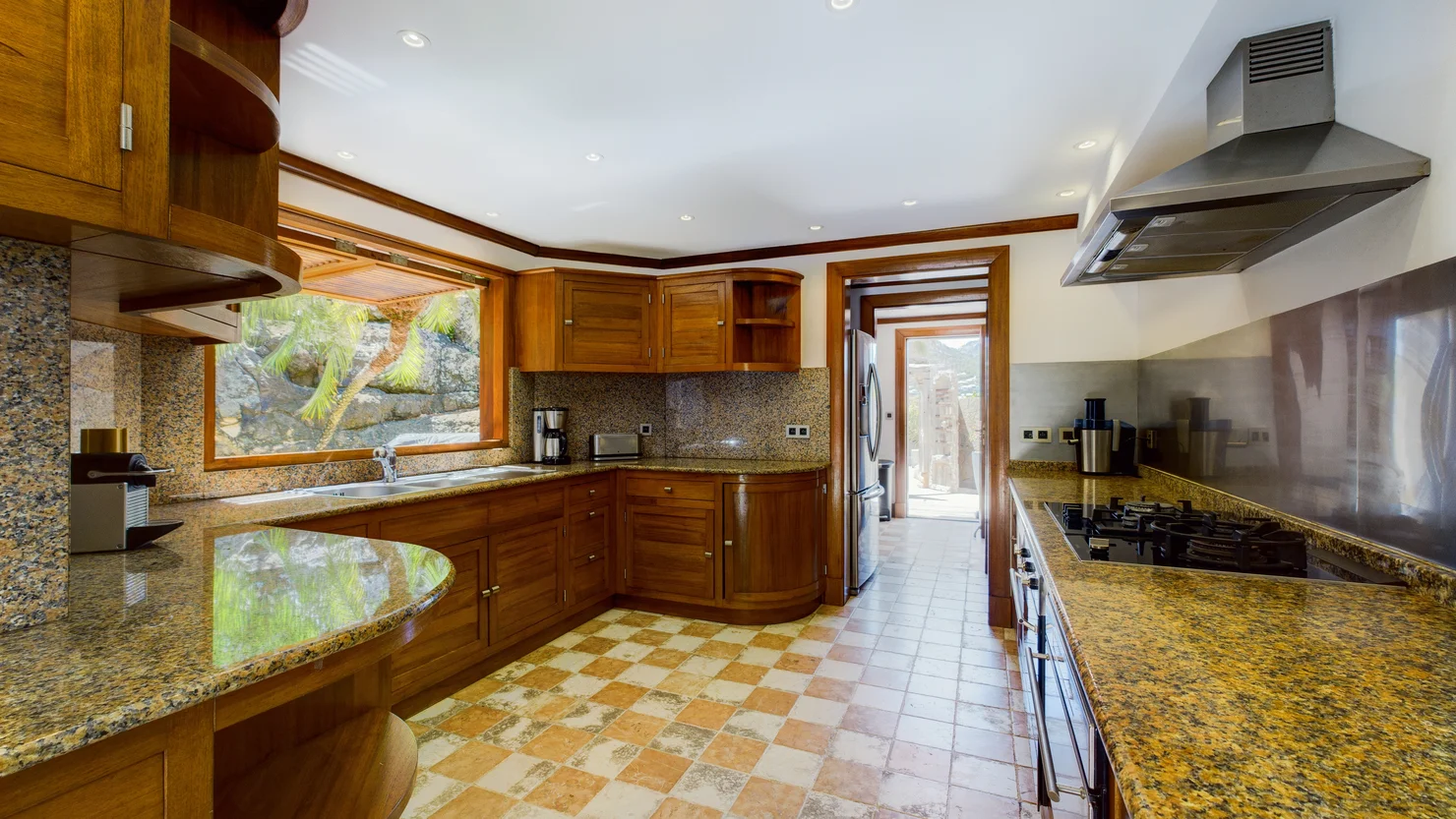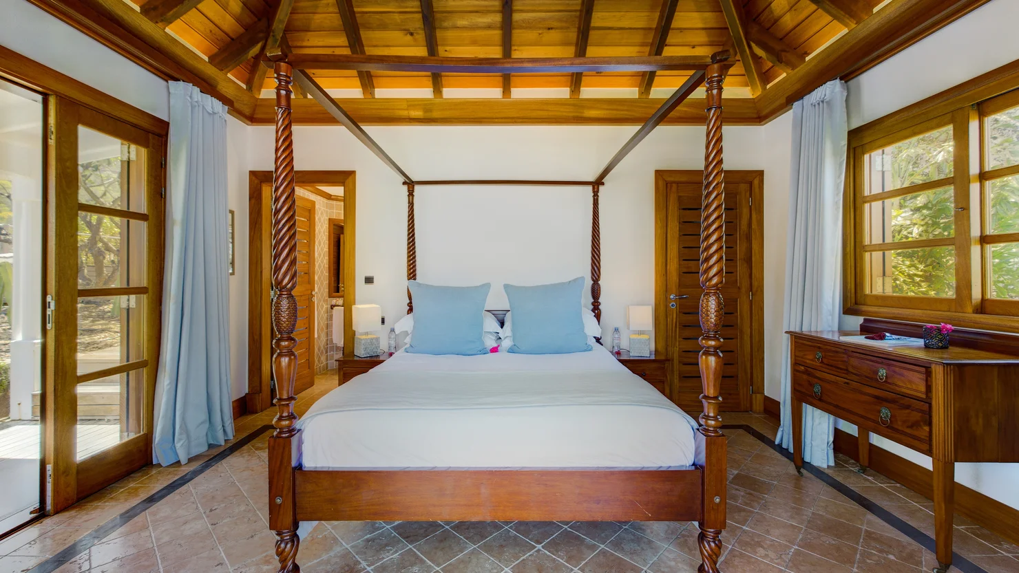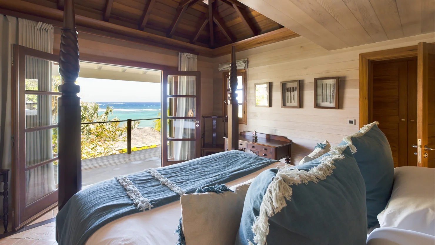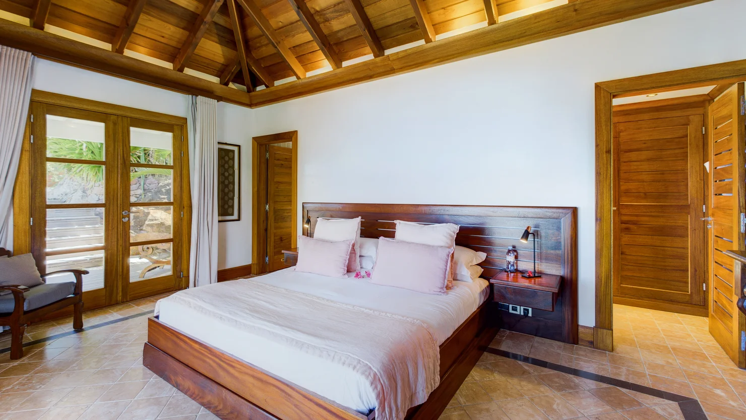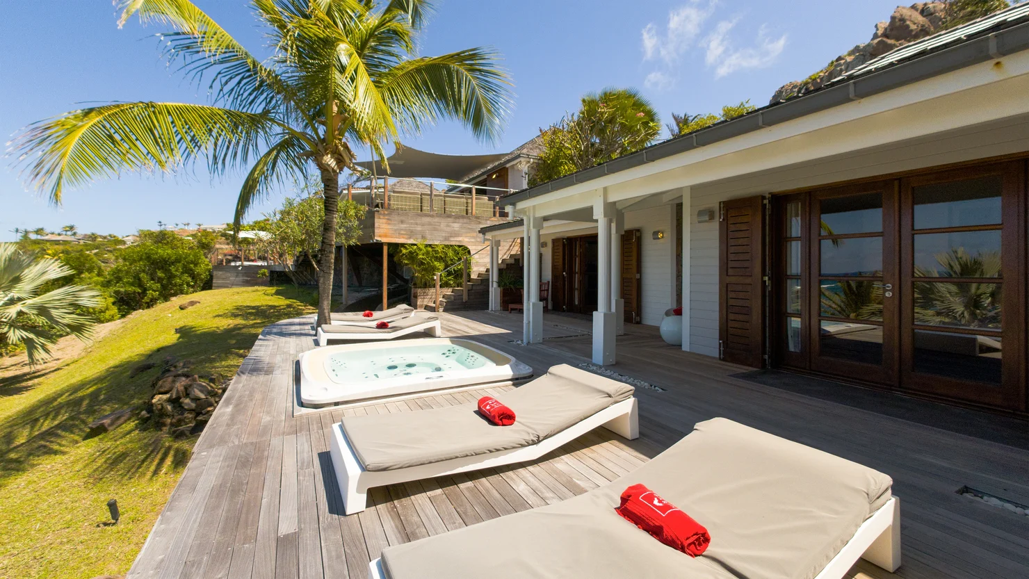 The villa Indian Song offers five beautifully appointed bedrooms distributed across three levels, each with en-suite bathrooms, air conditioning, and captivating sea views. Their warm wood interiors evoke an atmosphere of understated luxury, blending authenticity with modern comfort. On the lower level, two bedrooms share a terrace complete with a jacuzzi, perfect for unwinding while admiring the spectacular surroundings. Three additional bedrooms are perched higher on the hillside, offering both intimacy and charm.