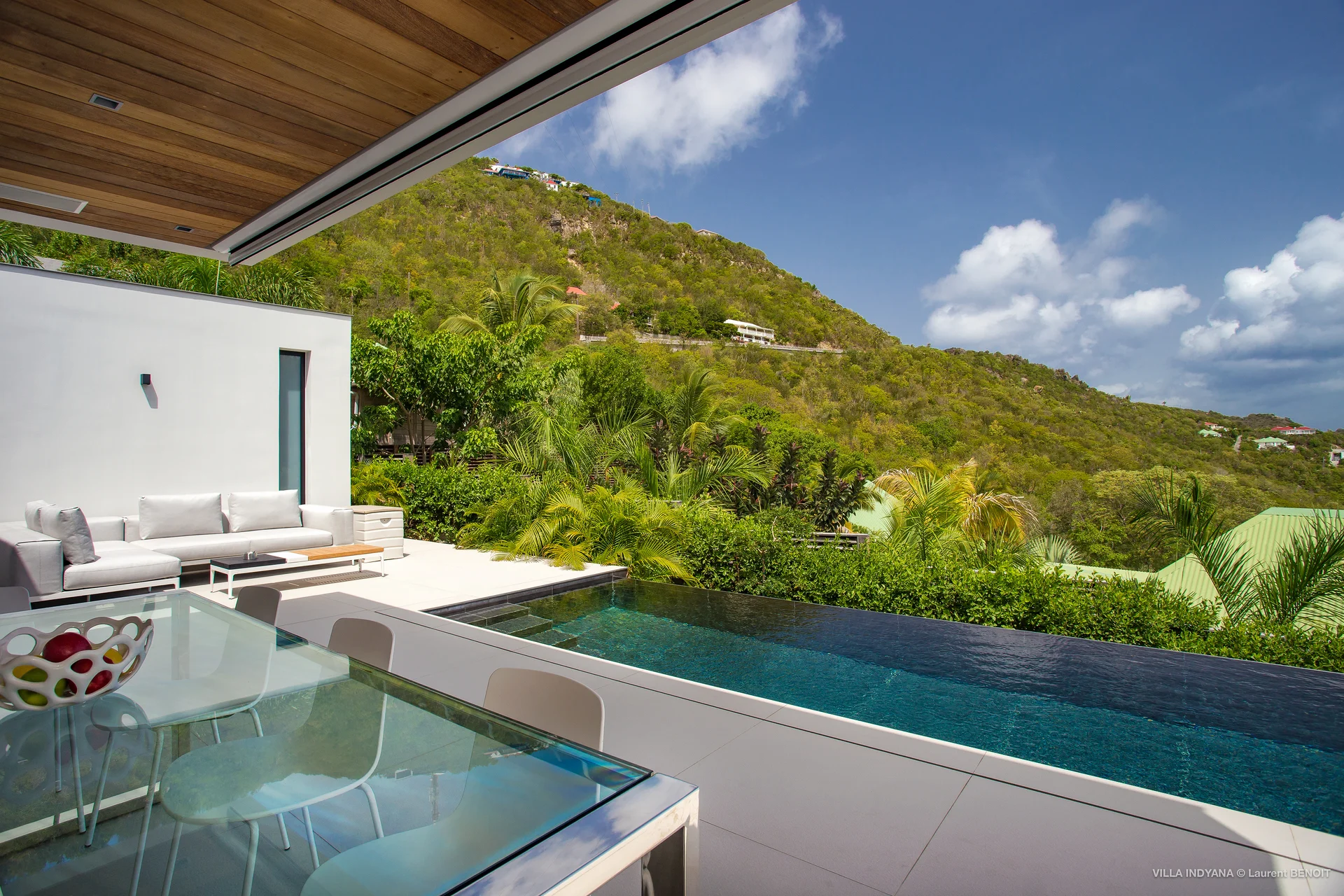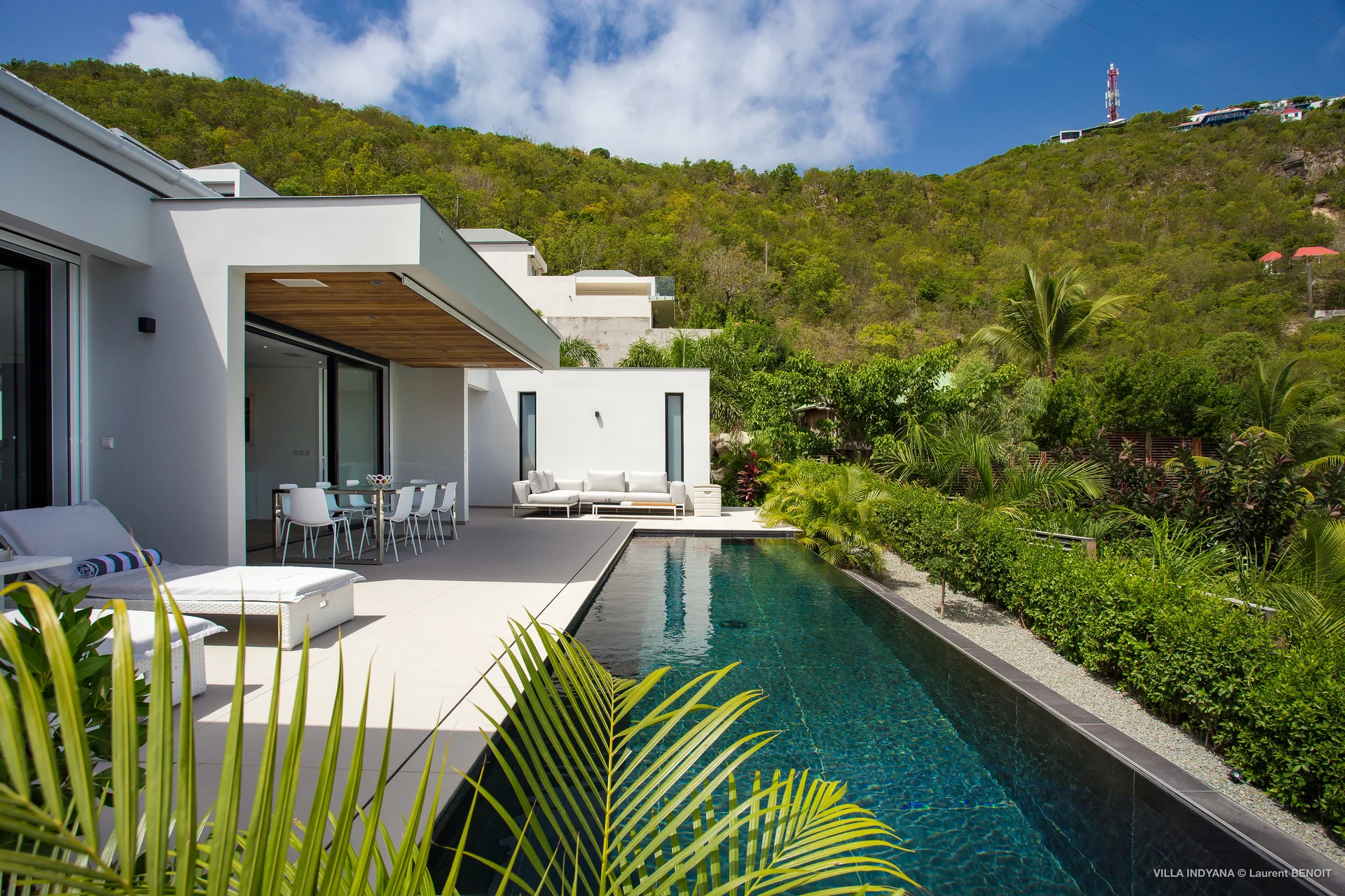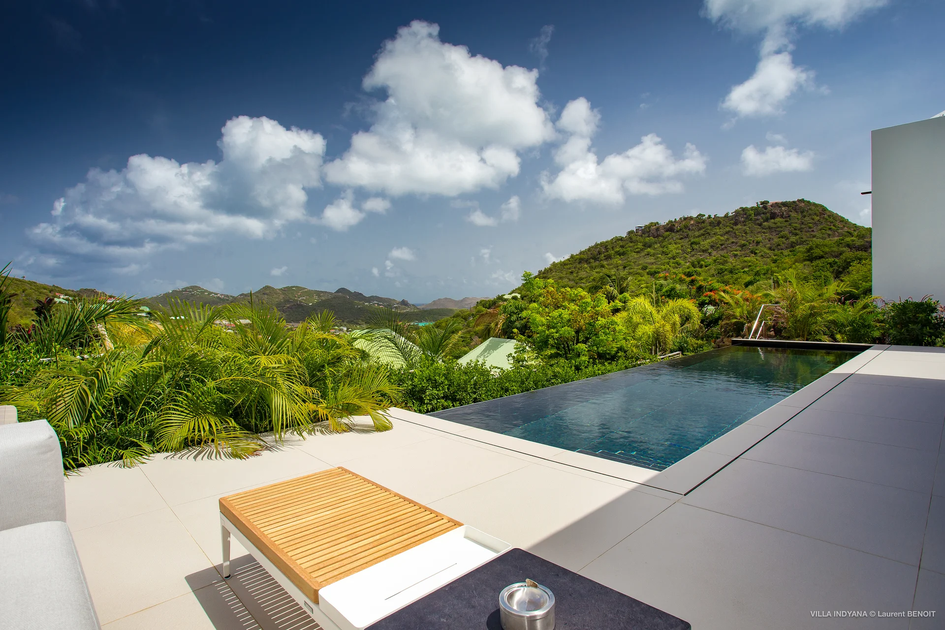 Villa Indyana is a serene retreat perched above the rolling hills of St Barth, offering peaceful views of lush greenery, swaying palms, flamboyant trees, and open blue skies. Designed with clean lines and a palette of soothing slate and charcoal grays with white and subtle pops of color, the villa exudes calm sophistication. It is perfect for small families or couples seeking a relaxed, yet stylish escape, where Caribbean breezes and tranquil surroundings set the tone for everyday indulgence.