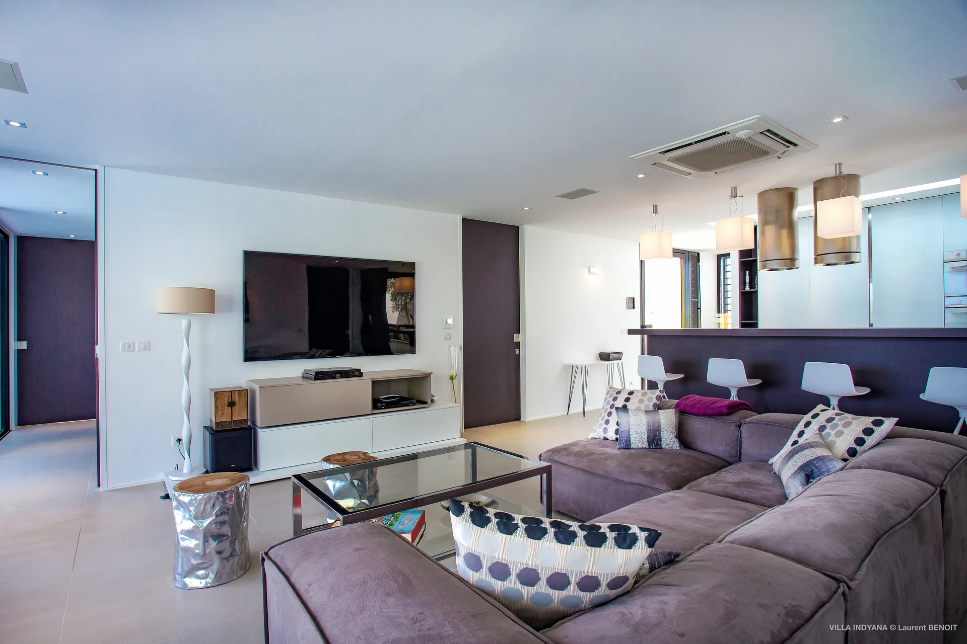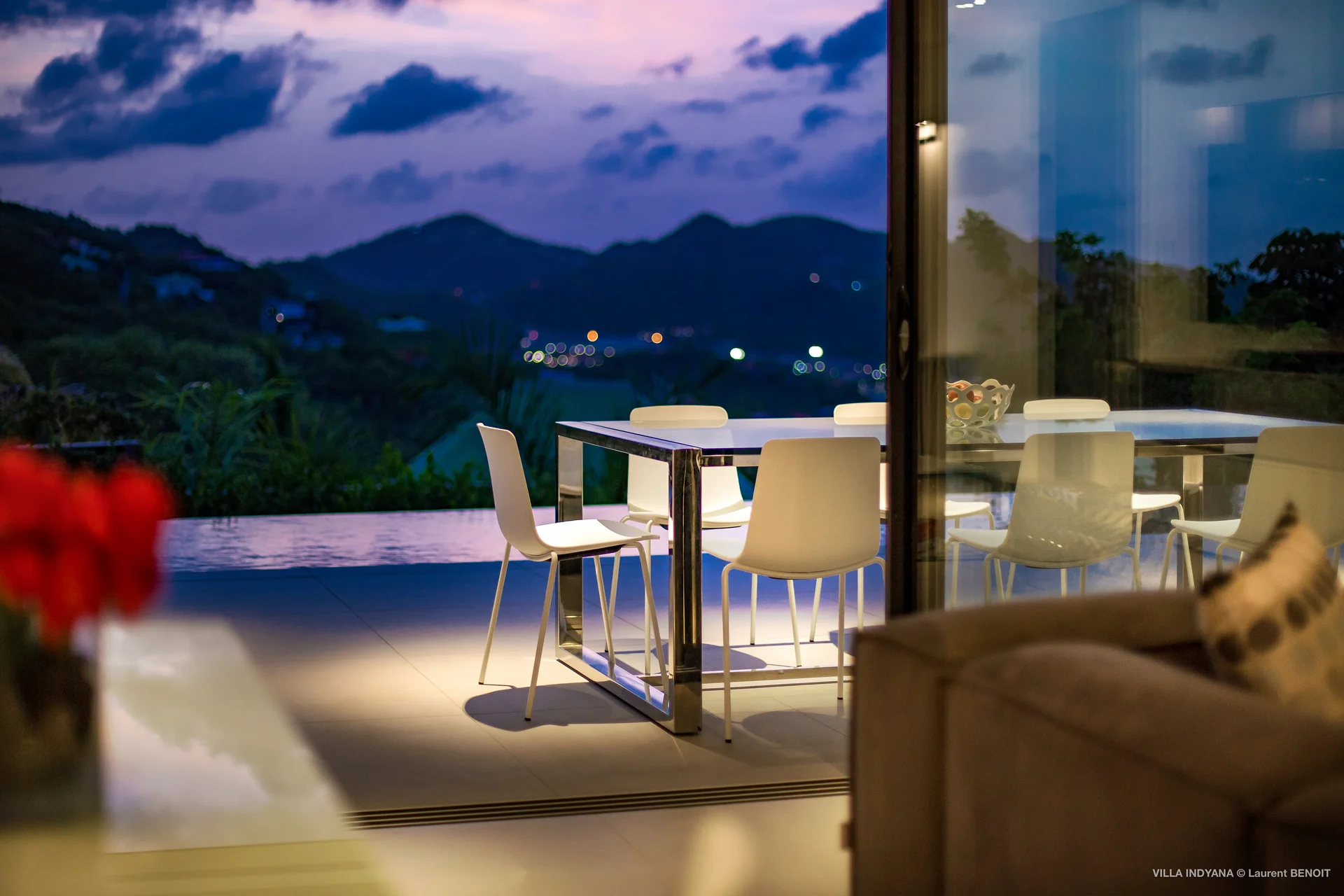 The heart of Villa Indyana is a central great room that seamlessly integrates indoor and outdoor living. The living area flows into an open dining space and a fully equipped kitchen. A large kitchen island with a stove and barstools allows conversations to continue while meals are being prepared. A skylight floods the space with natural light, complementing the villa’s airy atmosphere. The outdoor terrace extends from the living space and includes a sun-soaked seating area with comfortable couches, a low coffee table, sunbeds positioned for sun or shade, and a dark slate infinity pool that blends effortlessly with the surrounding landscape.