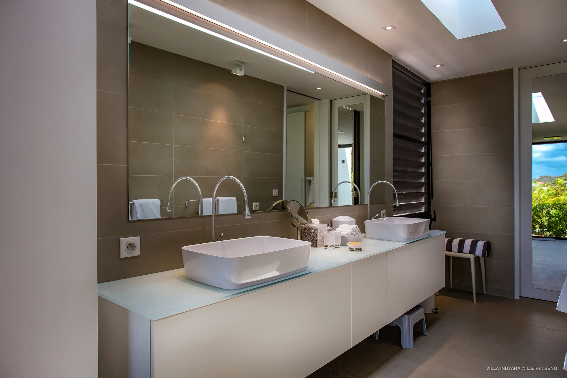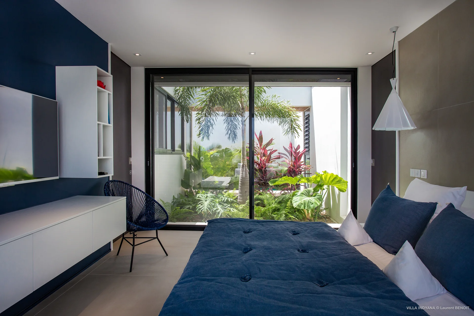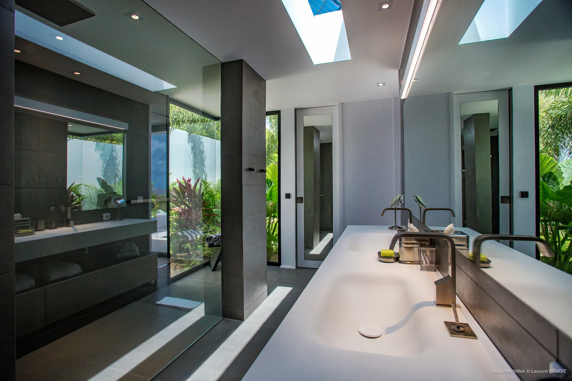 Two bedrooms sit on opposite sides of the central living area, ensuring privacy for all guests. Both feature king-size beds, sliding glass doors that open directly onto the terrace, and spacious ensuite bathrooms. One bedroom includes a separate dressing area, while the other has double vanities and a skylight that brings in the soft morning light. An independent studio has recently been added, allowing the villa to accommodate three bedrooms while maintaining privacy and comfort.